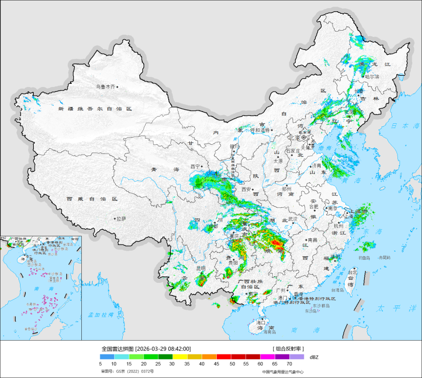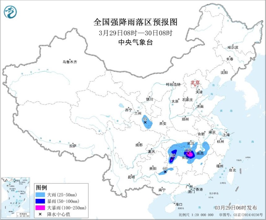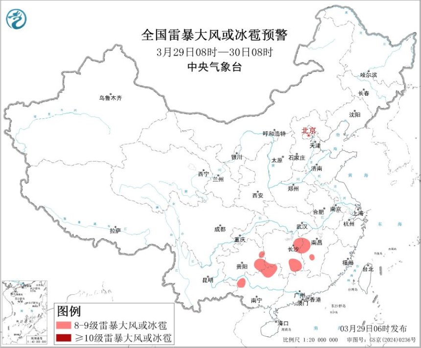 中央气象台3月29日06时继续发布强对流天气蓝色预警