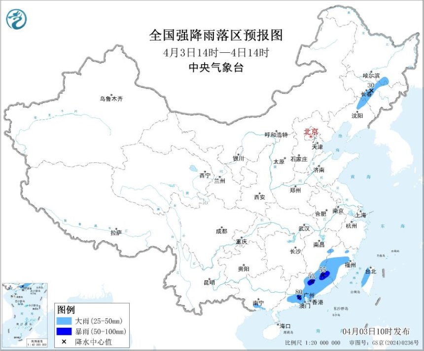 中央气象台4月3日10时继续发布暴雨蓝色预警