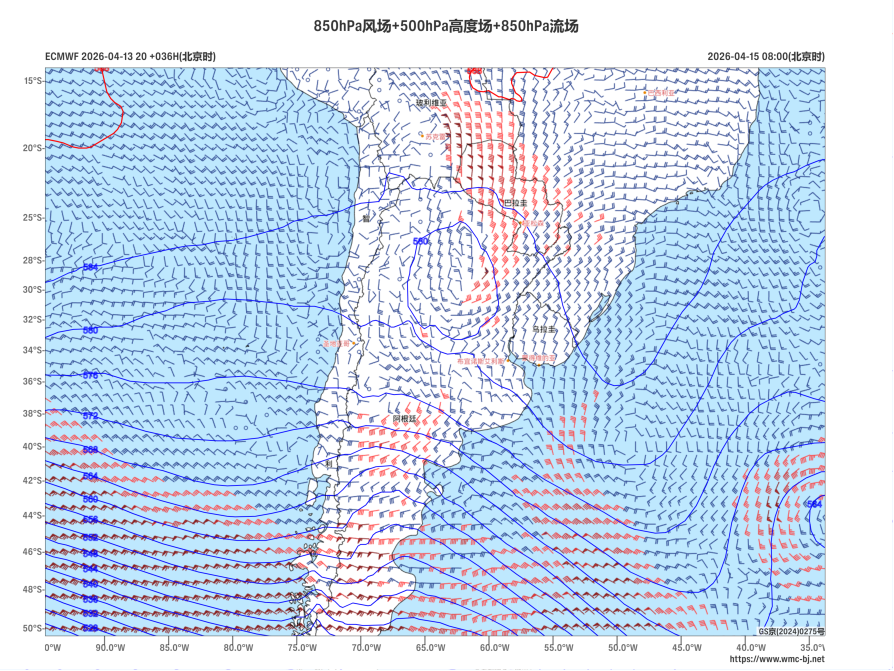 图1 2026年4月15日08时(北京时)500hPa位势高度(等值线,单位:dagpm)和850hPa风场预报(风羽,单位:m/s)