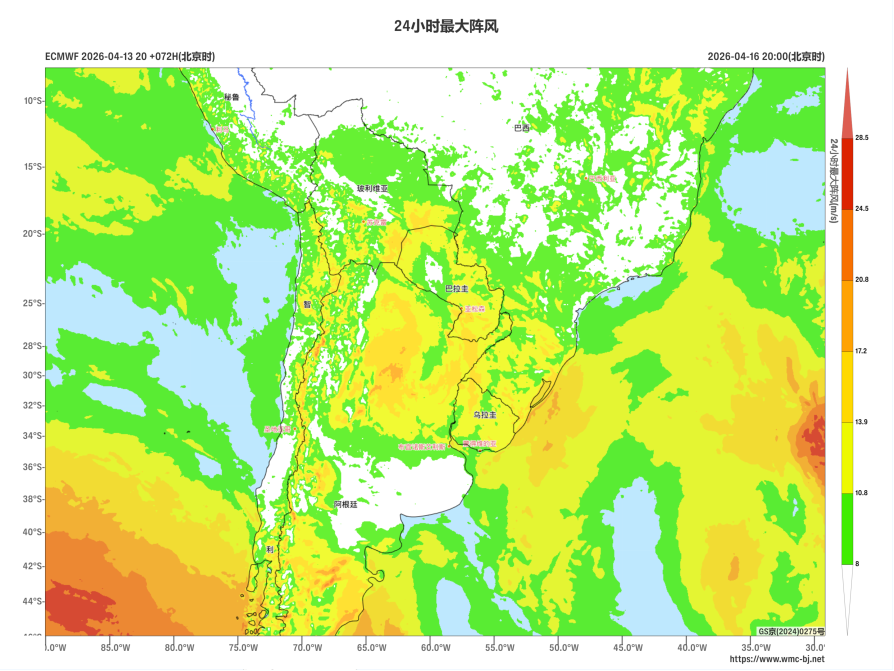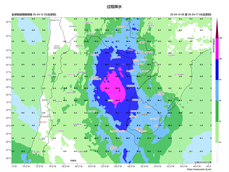 受高空槽东移影响(图1),预计4月14-16日,南美洲中南部地区将有一次强降雨天气过程。阿根廷北部、巴拉圭、乌拉圭等地将出现中到大雨,局地暴雨或大暴雨;上述部分地区过程累计降水量50~80毫米,其中阿根廷圣菲省北部和查科省南部等地的部分地区可达110毫米以上(图2);部分地区伴有4~6级大风,阵风7级以上(图3)。需关注强降雨可能造成的山洪、城市内涝等次生灾害。
