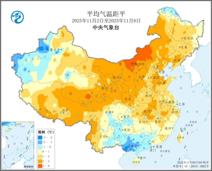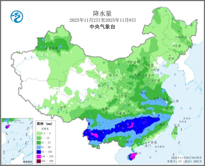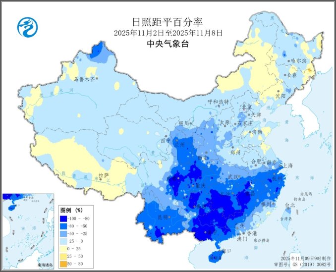 本周(2025年11月2日-11月8日),全国大部农区气温较常年偏高1~2℃,其中内蒙古、华北大部、西北地区中东部、青藏高原东部等地偏高2~4℃;仅广西中南部、新疆西部等地偏低1~4℃(图1)。本周较强降水主要集中在南方农区,江淮南部、江汉东部、江南大部、华南北部、海南、云贵等地降水量普遍有25~100毫米,局地100~250毫米(图2),上述地区较常年同期偏多1~4倍;其余农区大部降水量不足25毫米或无有效降水。全国日照较常年同期偏少,其中西北地区东部、江汉大部、江淮南部、江南、华南大部、西南地区东部和南部等地偏少3~9成(图3)。
