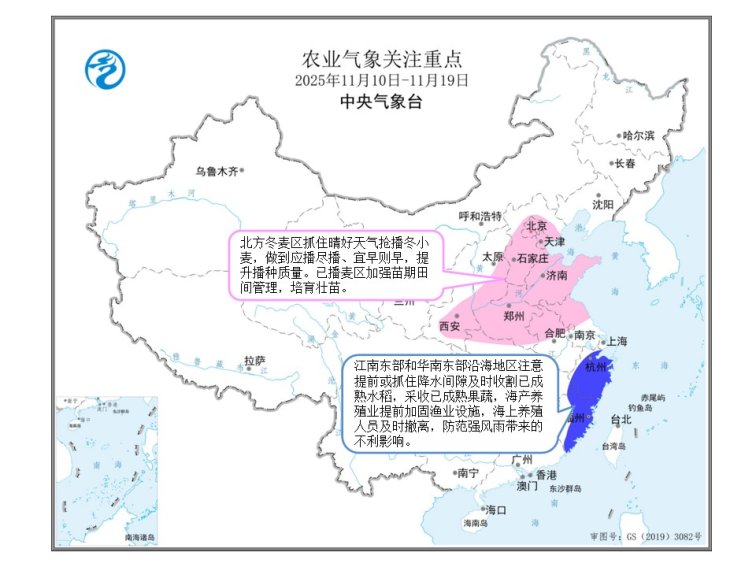 建议:北方冬麦区抓住晴好天气抢播冬小麦,做到应播尽播、宜早则早,提升播种质量。已播麦区加强苗期田间管理,培育壮苗。北方各地,特别是新疆、内蒙古、东北地区,注意做好设施棚圈加固和保温防寒工作。