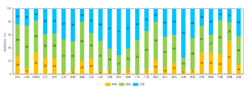 附图2 11月9日分省20厘米土壤墒情统计(站点百分比)