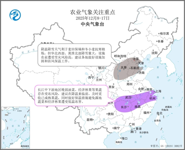 建议:北方设施农业和畜牧业要做好防风保温工作,加固棚膜,根据天气变化及时加盖防寒物,做好温室内小气候环境调控。北方冬麦区视田间苗情和墒情做好冬前麦田管理工作,适时划锄追肥,促进冬小麦扎根分蘖,促弱转壮,确保冬小麦安全越冬。南方农区加强冬种作物田间管理,做好清沟理渠,中耕松土、培肥防病等工作,促进油菜等作物稳健生长和安全越冬;在降温来临前及时采收已成熟果蔬,加强采后果园的越冬管理,及时浇水、修剪树枝,同时做好保温措施避免露地蔬菜和经济林果遭受低温冻害。