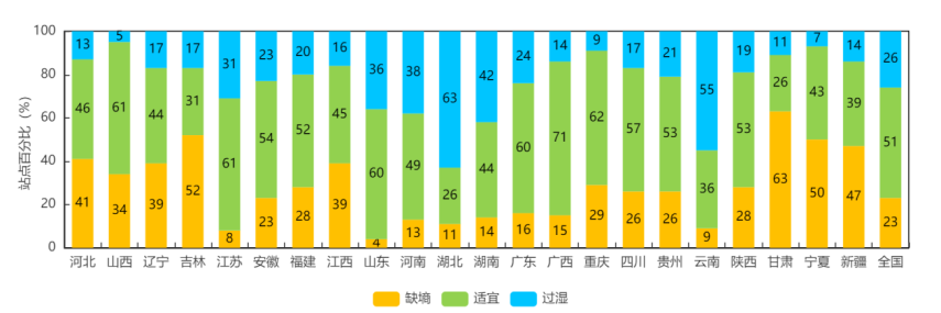 附图2 12月6日分省20厘米土壤墒情统计(站点百分比)
