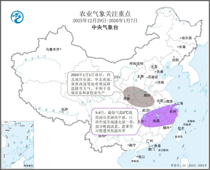 本周(2025年12月21日-12月27日),全国大部农区气温较常年同期偏高1~4℃,新疆西北部等地偏高4~6℃;受冷空气影响,内蒙古东北部、黑龙江北部和西部等地偏低1~6℃(图1)。东北地区中东部、黄淮东部、江淮西部、江汉、江南、华南西部、西南地区东南部等地大部降水量有5~25毫米,其中广西北部部分地区有25~50毫米(图2),上述大部地区较常年同期偏多3成至2倍,其中东北地区中部、黄淮东部等地偏多2~4倍;全国其余大部农区降水量不足5毫米或无降水;吉林中部和辽宁大部新增5~10厘米积雪,新疆北部、内蒙古东北部、黑龙江大部积雪深度有10~20厘米、局地达20~50厘米(图3)。全国大部农区日照时数接近常年同期或偏少,其中新疆西部、西南地区东部及广西西部等地偏少5~9成,仅新疆北疆东部、东北地区中部、华北大部等地偏多2~5成(图4)。