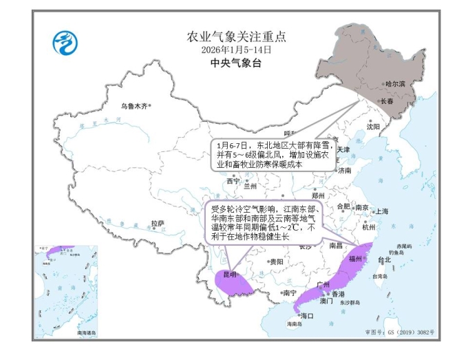 预计未来10天,影响我国的冷空气势力不强,但活动频繁;北方冬麦区大部气温接近常年同期,气温波动对冬小麦安全越冬无明显影响。1月6-7日,内蒙古东北部、东北地区有小雪,并有5~6级偏北风,气温下降4~10℃、部分地区12℃以上;8-9日,冷空气将继续影响内蒙古东北部及东北地区;11日起,新一轮冷空气将影响我国中东部地区,对设施农业和畜牧业生产不利。受多轮冷空气影响,江南东部、华南东部和南部及云南等地平均气温较常年同期偏低1~2℃,不利于在地作物稳健生长(图4);另外,四川盆地西部、云贵高原等地累计降水量有3~15毫米,局部地区可达20毫米以上,利于补充农田土壤水分和库塘蓄水。