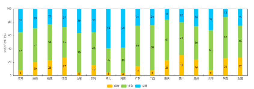 附图2 1月4日分省20厘米土壤墒情统计(站点百分比)