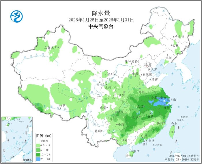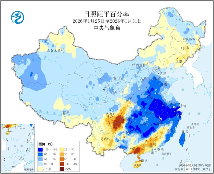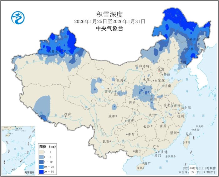 本周(2026年1月25日-2026年1月31日),全国大部农区气温接近常年同期或偏高1~4℃,内蒙古东部、东北地区大部偏低1~4℃,局地偏低4~6℃(图1)。黄淮南部、江淮、江汉、江南北部、华南东部和西北部、重庆南部、贵州北部等地降水量有5~25毫米,其中江苏南部、安徽南部和浙江北部部分地区降水量有25~50毫米,上述大部地区降水量较常年同期偏多8成至2倍,全国其余大部农区无降水或降水量不足5毫米(图2);内蒙古东部、东北地区大部、新疆北部、山西南部、陕西中部、河南西部等地最大积雪深度为1~10厘米,部分地区为10~50厘米(图3)。全国大部农区日照时数接近常年同期或偏少3~5成,其中华北东南部、黄淮西部、江淮、江汉、江南大部、贵州东部、广西西部等地日照时数偏少5~9成;东北地区东南部、陕西南部、四川东部、重庆西部、贵州西北部、云南东部、江西南部、福建西部、广东大部、广西东南部等地偏多3~5成,局地偏多5成至2倍(图4)。