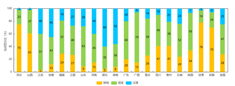 附图2 1月31日分省20厘米土壤墒情统计(站点百分比)