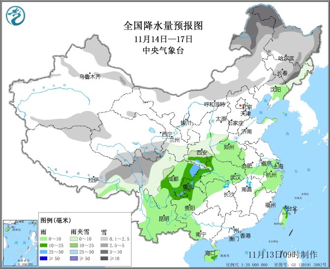 图2 全国降水量预报图(11月14日-17日)