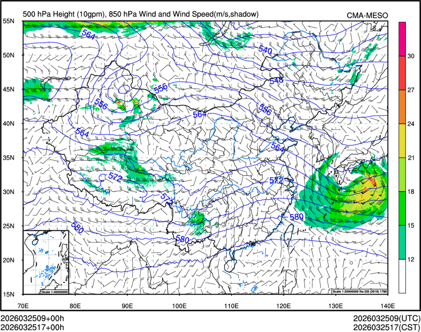 500hPa高度+850风场+850大风速(大于等于12)