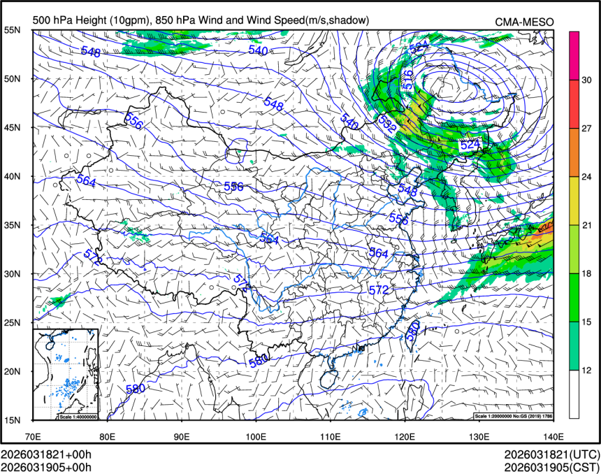 500hPa高度+850风场+850大风速(大于等于12)