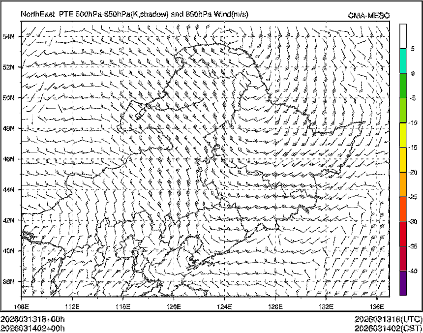 500与850假相当位温之差+850hPa风场