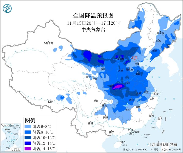 其中,11月15日20时至17日20时,西北地区东部、内蒙古、华北、东北地区中东部、黄淮、江汉、江淮、江南北部和西部等地气温下降6~10℃,内蒙古中西部、山西北部、河北北部、陕西东南部、河南西部、湖北北部等地部分地区降温10℃~14℃。