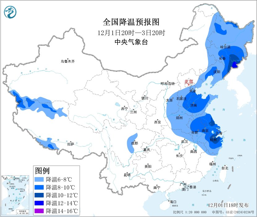 其中12月1日20时至3日20时,黑龙江南部、吉林东部、辽宁中东部、山东、安徽中北部、江苏、浙江等地部分地区降温8~10℃,局地可达12℃以上。