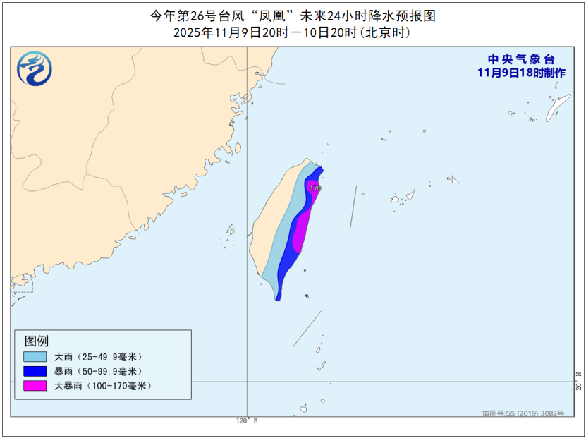 降水预报:10日14时到11日14时,台湾岛大部将有大到暴雨,其中东部部分地区有大暴雨到特大暴雨(250-300毫米)。