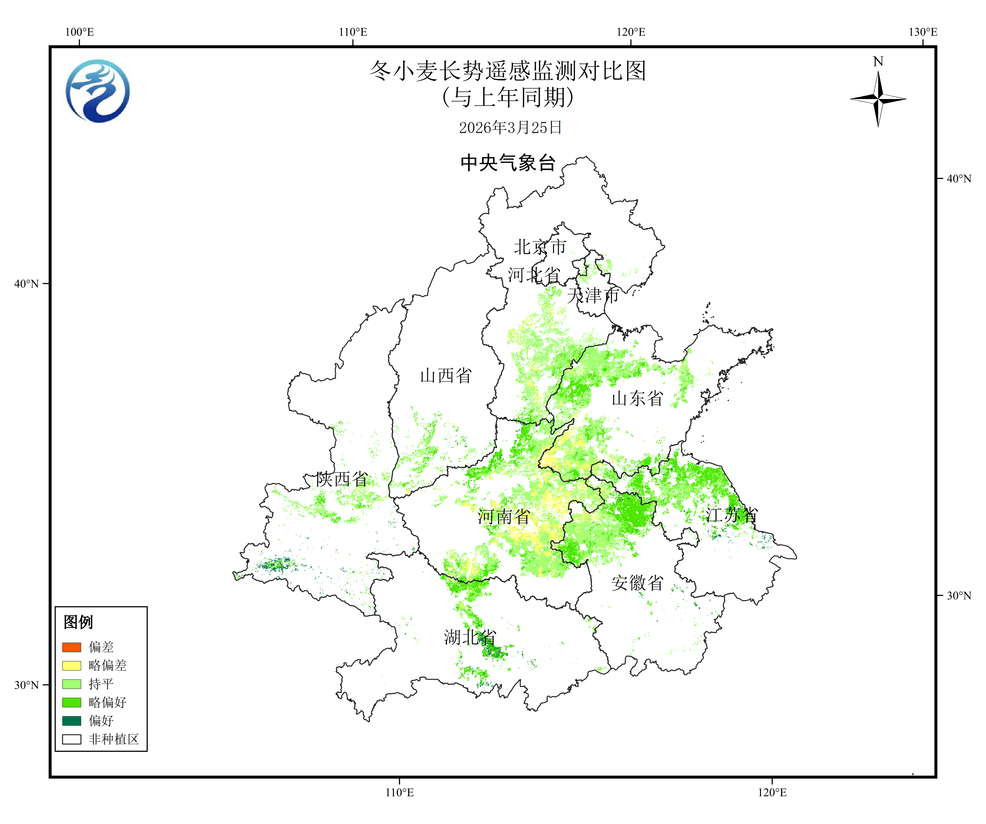 目前,华北、黄淮北部、西北地区东部和新疆大部冬小麦普遍处于返青至起身期,黄淮南部、江淮和江汉及陕西关中处于拔节至孕穗期,西南地区大部处于孕穗至抽穗开花期,四川南部、云南东部部分进入乳熟期;大部冬小麦发育期接近常年同期或偏早3~6天,部分地区偏早7天以上。3月25日冬小麦长势遥感监测结果显示:与去年同期相比,冬小麦长势持平或偏好的比例为87.4%(图1),长势偏差区域主要分布在山东西部、河南东部等地。