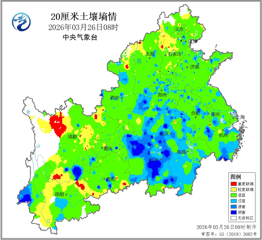 目前,长江中下游和西南地区大部油菜处于开花盛期,大部发育期接近常年同期或偏早3~7天。3月26日20厘米土壤水分监测结果表明,冬小麦和油菜产区大部土壤墒情适宜(图2);河北中部、四川中部和南部、云南中北部、贵州西南部部分地区土壤缺墒;湖北中南部、湖南大部、江西西部和南部、浙江东南部等地土壤过湿,湖北南部、湖南西北部和东南部、江西西南部等地部分地区出现渍害。