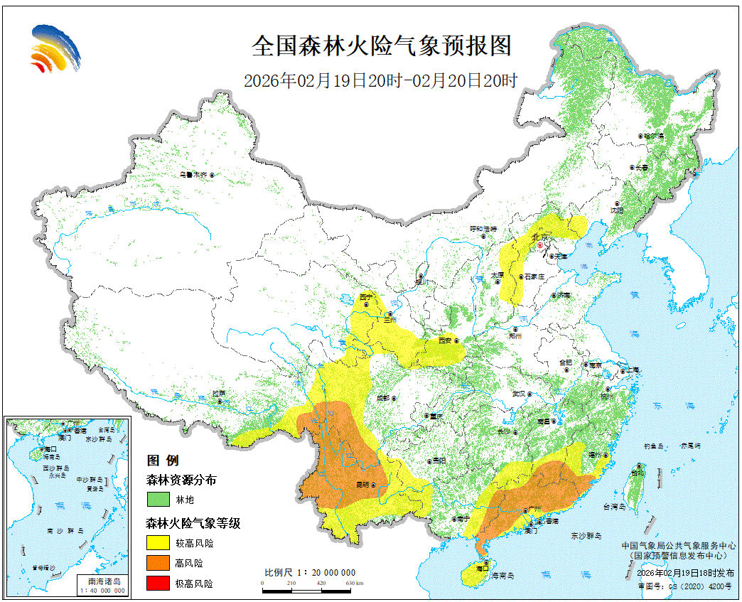 预计,2026年2月19日20时至2月20日20时,北京北部、河北北部和西部、山西东部、辽宁西部、福建南部、江西南部、湖南南部、广东大部、广西东部和西部、海南大部、四川西部和南部、贵州西部、云南大部、西藏东部、陕西南部、甘肃南部、青海东部等地的部分地区森林火险气象等级较高,其中,福建南部、江西南部、广东大部、广西东部、四川南部、云南中北部、西藏东南部的局部地区森林火险气象等级高。请各有关单位严加防范,加强火源管理,确保林区安全。