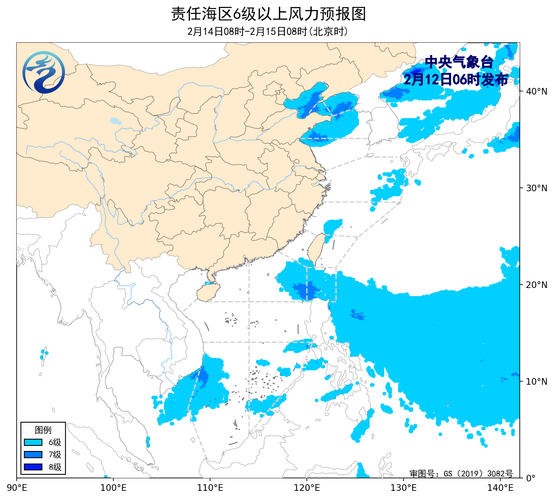 2月11日14时至12日02时,东海大部海域、台湾海峡、台湾以东洋面、南海东北部海域、南海西南部海域出现了5~6级、阵风7级的东北风或偏北风,巴士海峡出现了5~6级、阵风7级的偏东风。