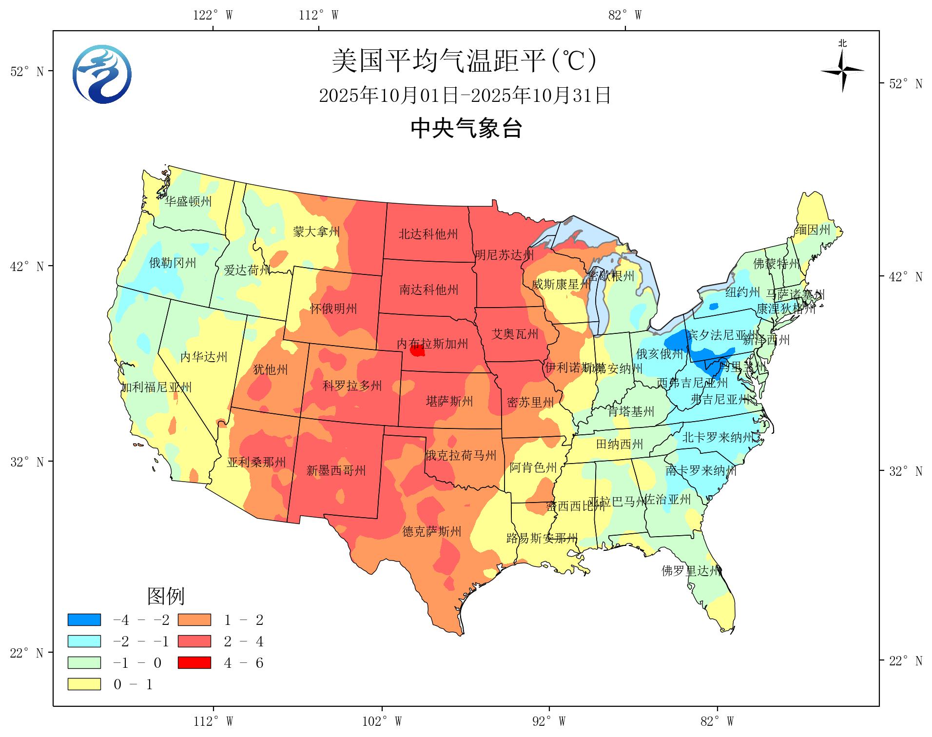 10月,美国中部气温较常年同期偏高1~4℃(图1),其中蒙大拿州东部、北达科他州、南达科州、内布拉斯加州、堪萨斯州西部、科罗拉多州东部、俄克拉荷马州西部和德克萨斯州西北部等地气温偏高2~4℃,其余大部地区气温接近常年同期或略偏低。全国大部降水量有10~100毫米(图2),其中中北部玉米产区大部在10~50毫米;西北部沿海以及中南部部分地区达100~250毫米。天气总体利于玉米和大豆成熟收获,玉米、大豆等作物收获进程接近常年,截至月底,收获约7~8成。冬小麦主产区大部出现10~50毫米降水,中北部产区大部土壤墒情适宜,利于小麦播种出苗;但科罗拉多州东部、堪萨斯州西部、德克萨斯州西北部等地部分农田墒情略差(图3),对冬小麦播种出苗略有不利;目前冬小麦播种过8成,较去年同期偏快。
