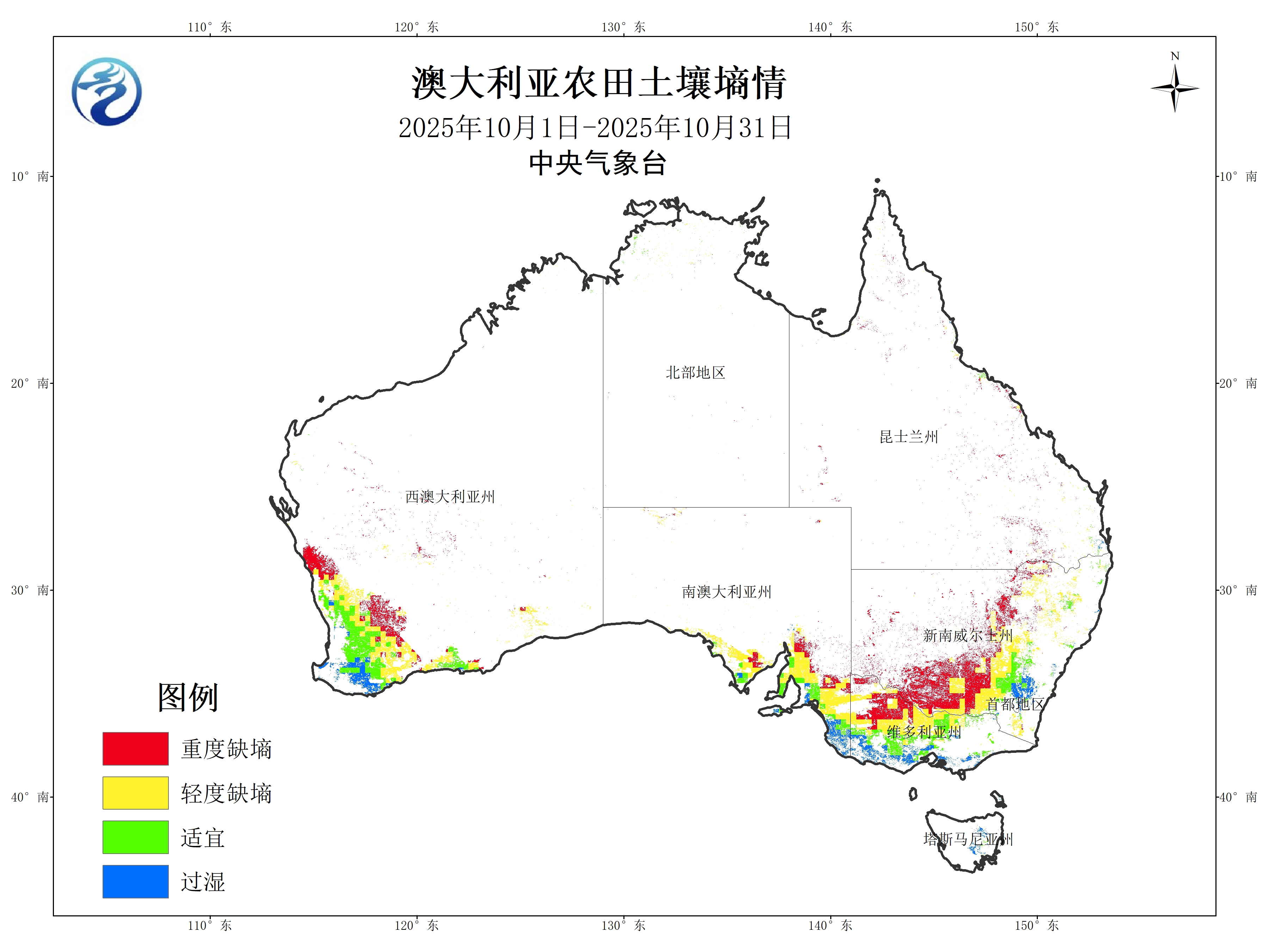 10月,澳大利亚小麦主产区大部气温接近常年同期或偏低1~2℃(图12),西澳大利亚州、南澳大利亚州、新南威尔士州东部出现10~50毫米降水,维多利亚州大部降水量达50~100毫米(图13),大部麦区土壤墒情较好(图14),水热条件利于小麦充分灌浆和产量形成;但新南威尔士州中部等地降水略偏少,部分农田墒情偏差,对小麦灌浆不利。