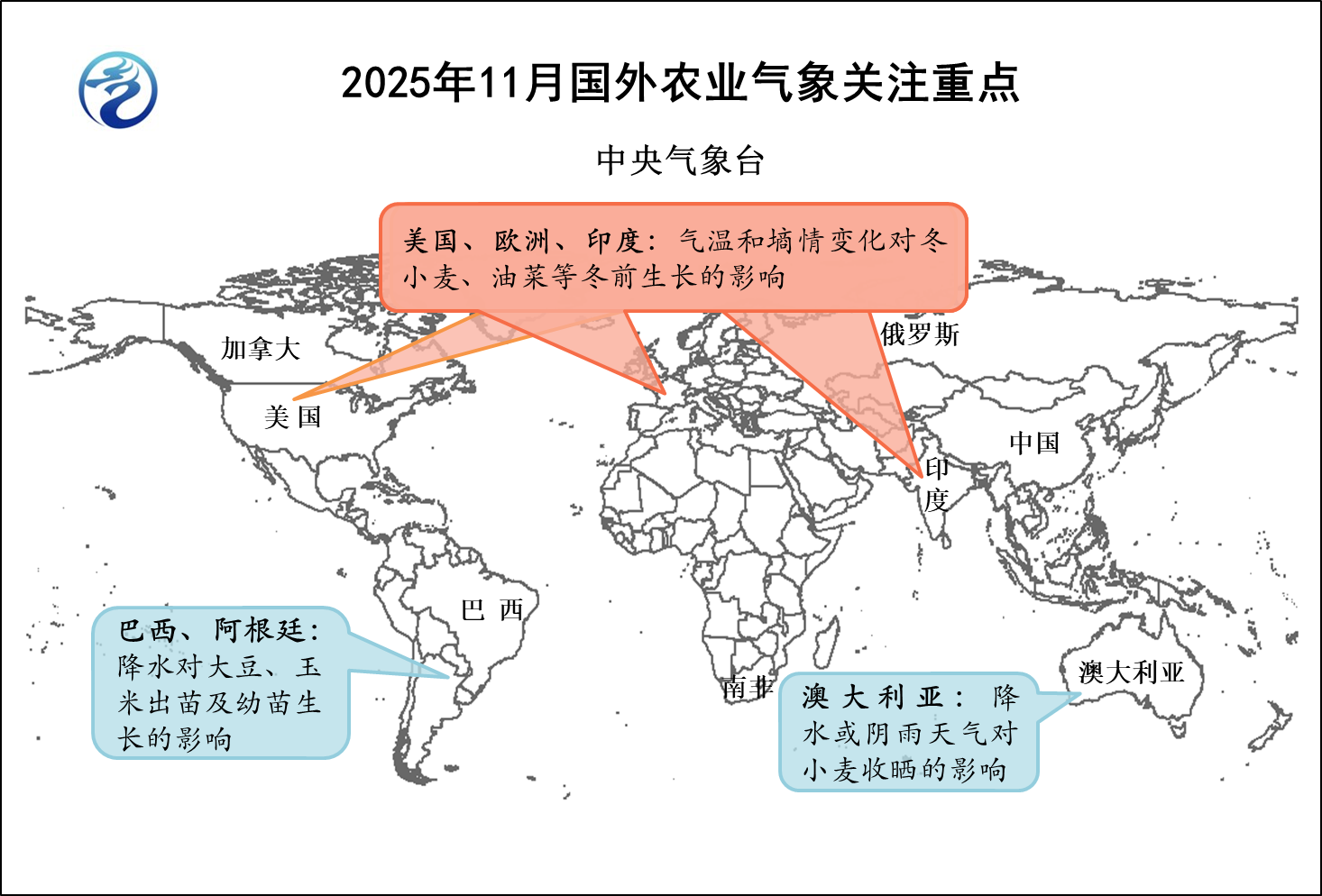 11月北半球需关注墒情和气温变化对冬小麦、油菜冬前生长的影响,南半球需关注降水对巴西、阿根廷大豆和玉米等作物幼苗生长以及澳大利亚小麦成熟收晒的影响。