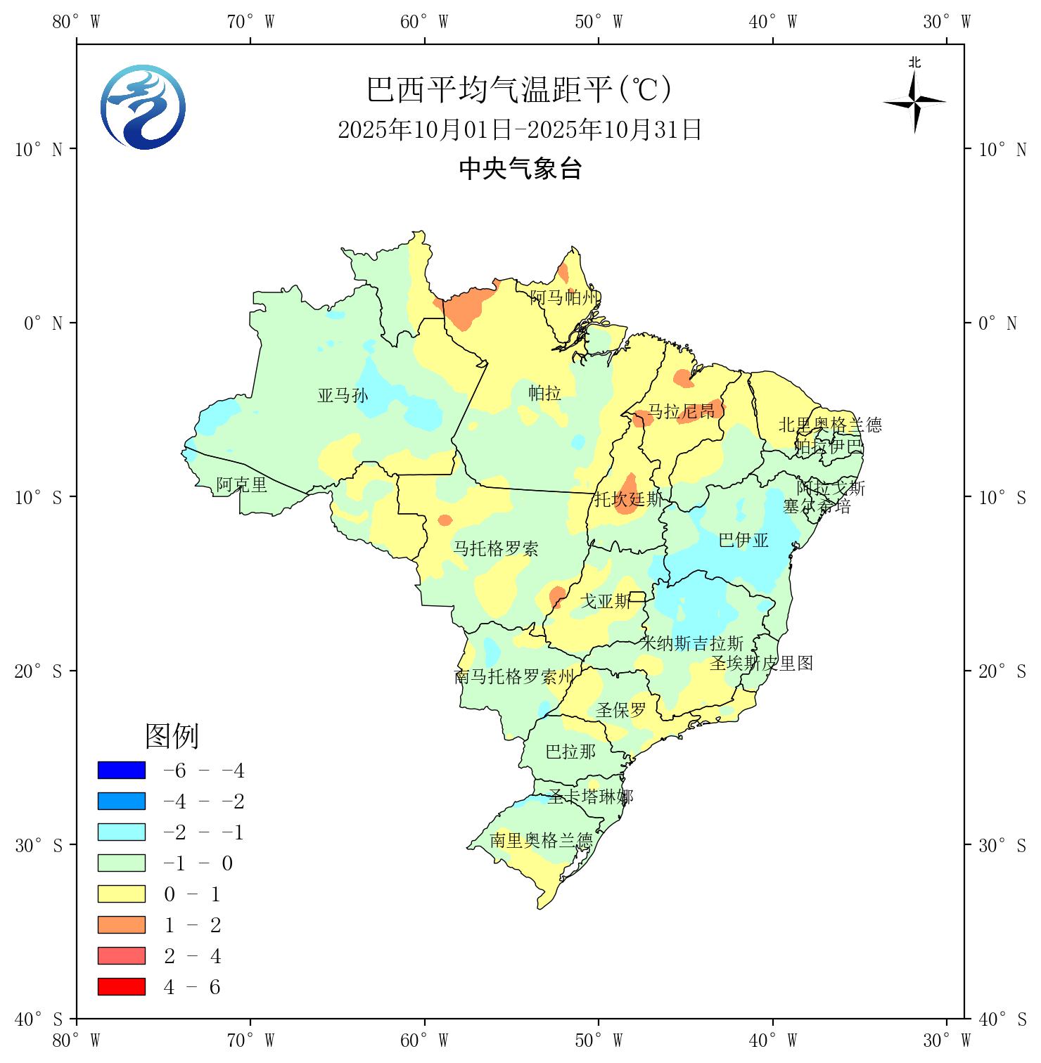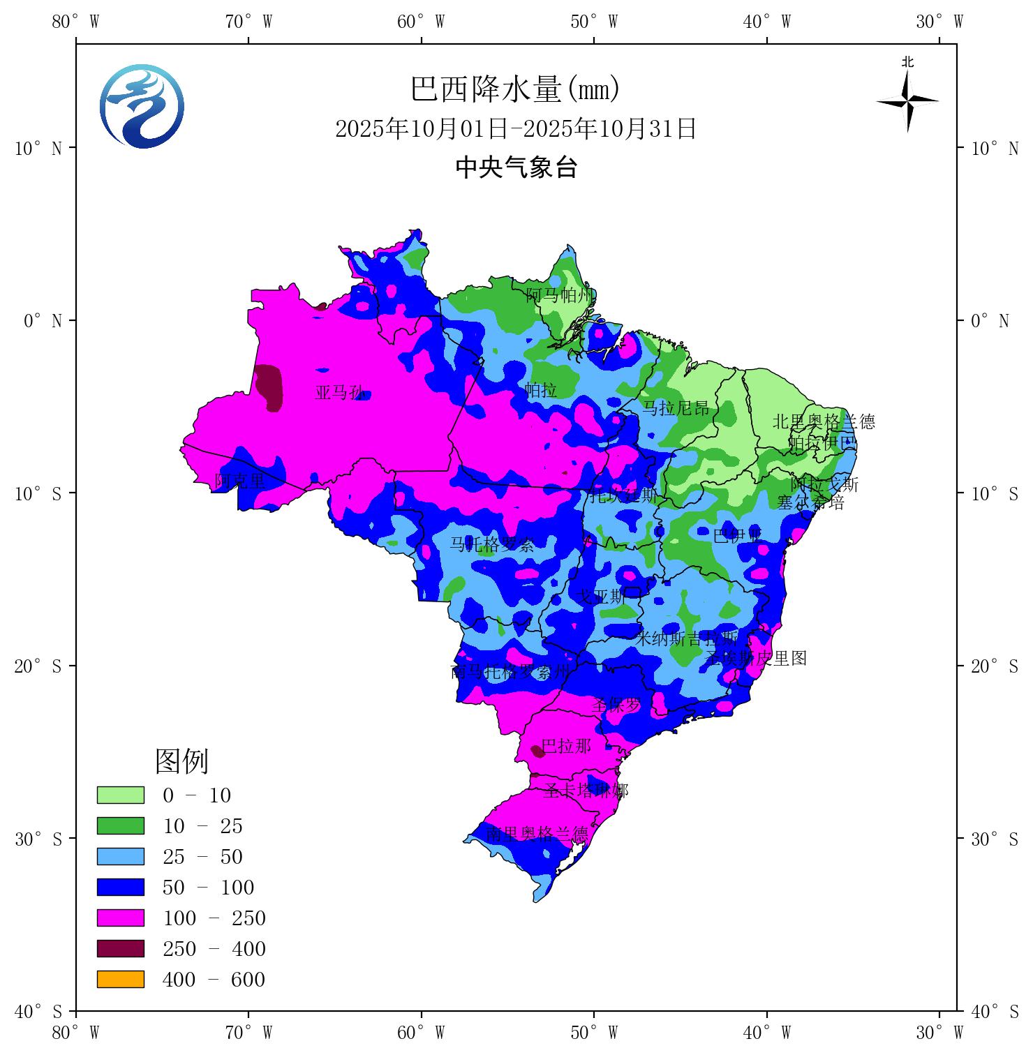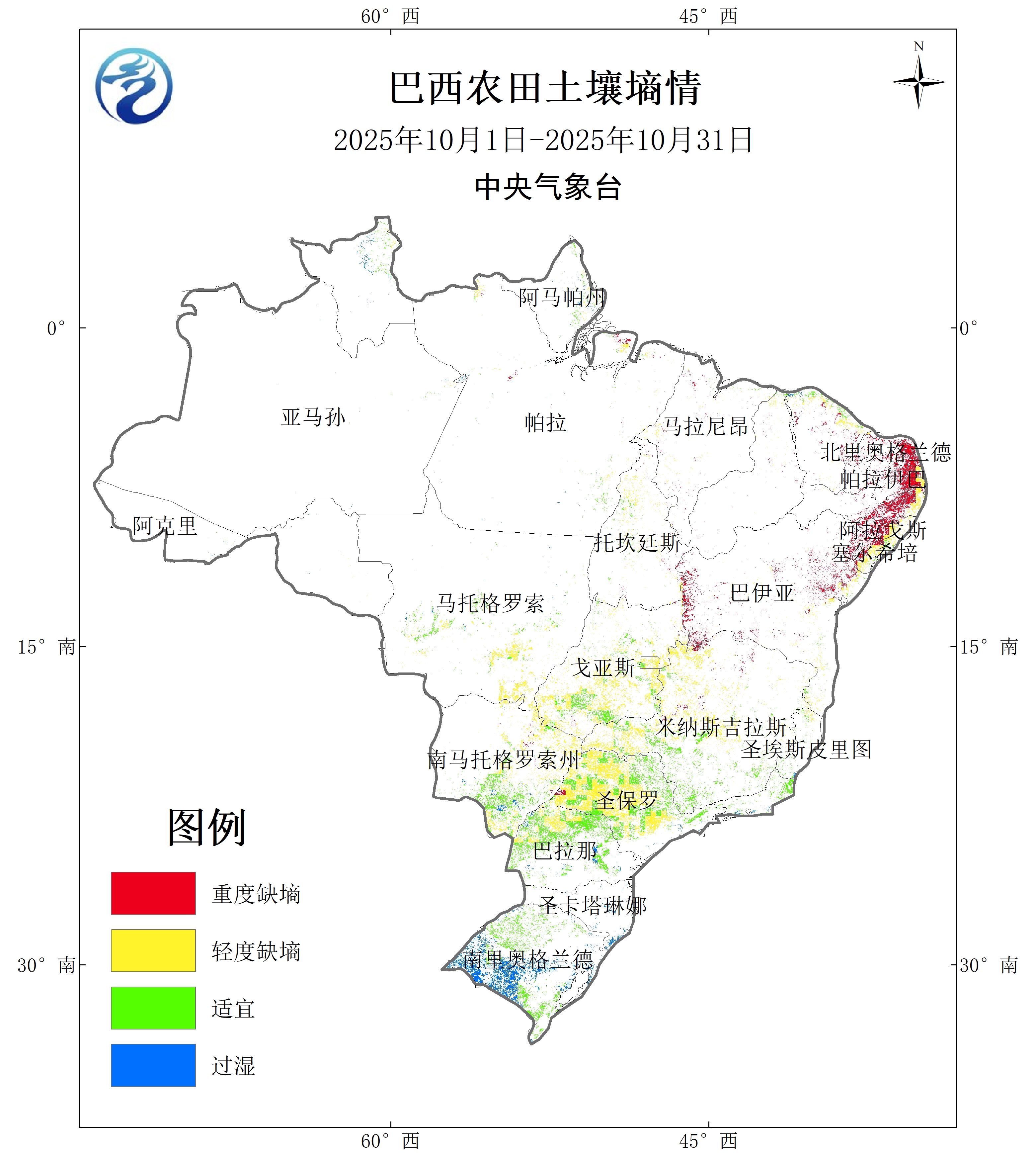 10月,巴西大部农区气温接近常年同期或略偏低(图4),中部农区出现明显降水,降水量普遍有25~100毫米(图5),降水有效补充土壤水分,农田墒情较适宜,晴雨相间天气利于头季玉米、大豆播种出苗及幼苗生长;巴拉那州、圣卡塔琳娜州、南里奥格兰德州等南部地区降水有100~250毫米,10月16-18日、10月23-28日两次短时强降水导致部分农田阶段性土壤过湿(图6),延缓玉米大豆播种进度;截至月底,大豆、玉米播种约5~6成。