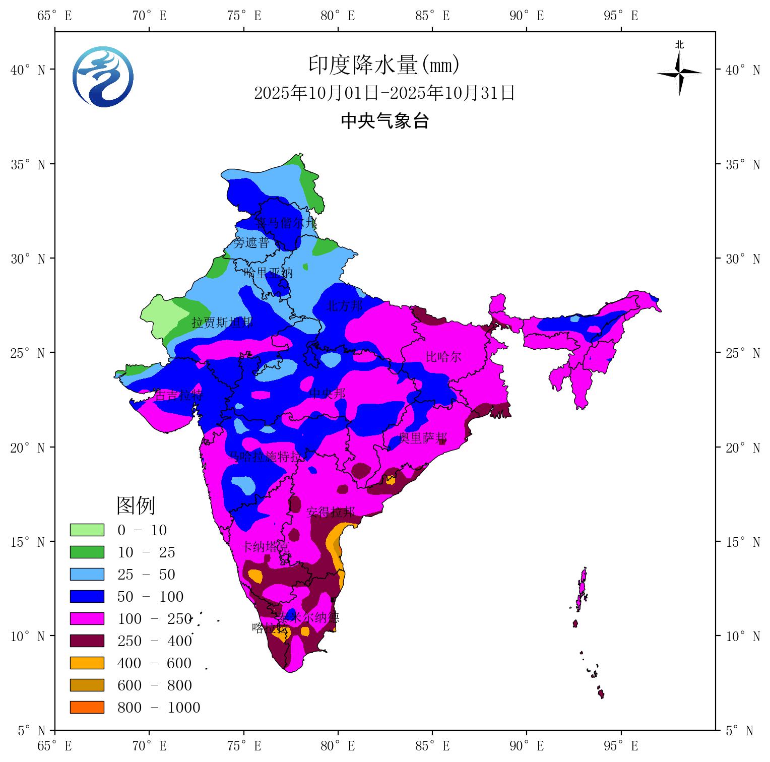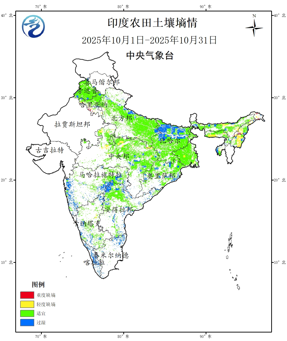 10月,印度平均气温接近常年同期(图7),大部地区降水量有50~250毫米(图8),有效补充农业生产用水,利于水稻生长发育和产量形成,同时也为11月将要种植的冬作物提供了良好的水分储备和土壤墒情(图9)。10月底,受孟加拉湾气旋风暴“蒙萨”影响,印度东南部出现中到大雨,部分地区暴雨,局地大暴雨,安得拉邦东南部等地降水量达250~400毫米,水稻等作物收获受阻、局地遭受暴雨洪涝灾害。