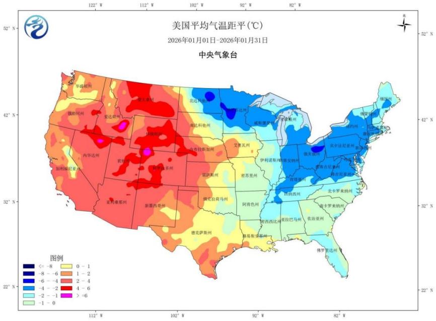 图1 2026年1月美国平均气温距平