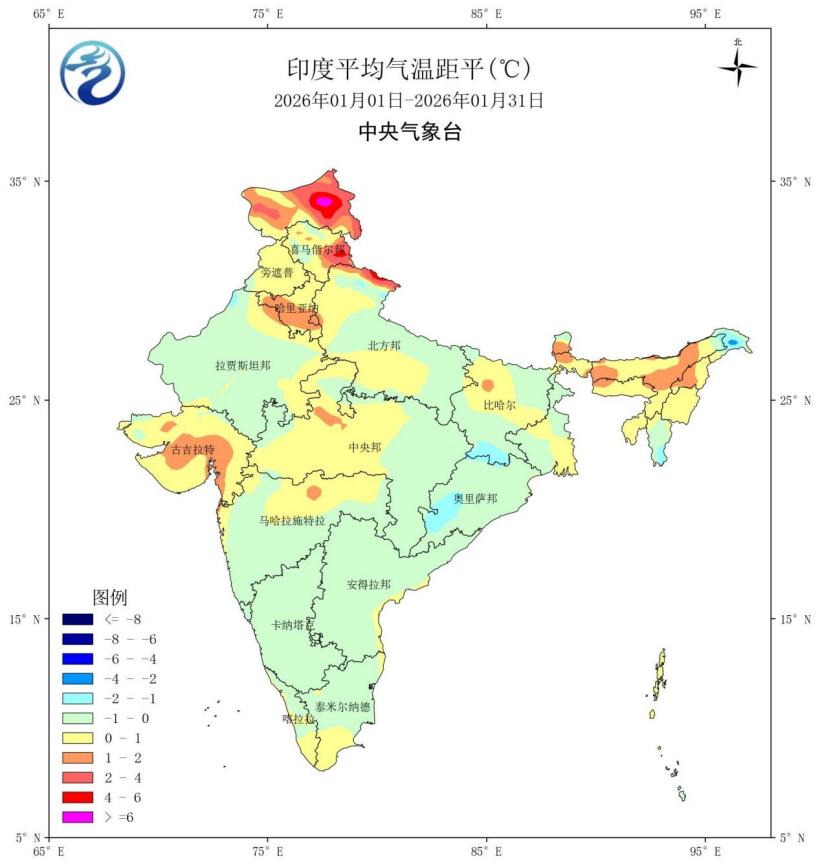 图11 2026年1月印度平均气温距平