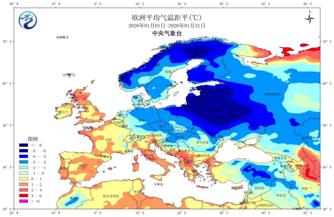 图14 2026年1月欧洲平均气温距平