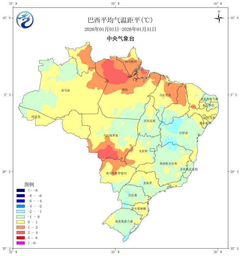 图5 2026年1月巴西平均气温距平