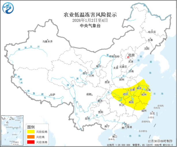 农业农村部和中国气象局12月30日联合发布农业低温冻害风险提示:预计2025年12月30日夜间至2026年1月2日,中东部有大范围雨雪天气,江汉、黄淮西部、山西南部和陕西中南部等地的部分地区有大雪、局地暴雪;受强冷空气影响,长江中下游地区等地气温将下降6~8℃,浙江、湖北西部等地部分地区降幅达10℃以上,1月3日凌晨最低气温0℃线将南压至江南中南部一带,2—4日江苏中南部、安徽中南部、湖北大部、江西中北部、浙江、福建北部等地油菜、露地蔬菜和经济林果遭受低温冻害风险较高。建议:提前检查加固生产设施,抢收成熟果蔬,并采取覆盖保温、应急增温、喷施防冻剂等措施防范农业低温冻害。