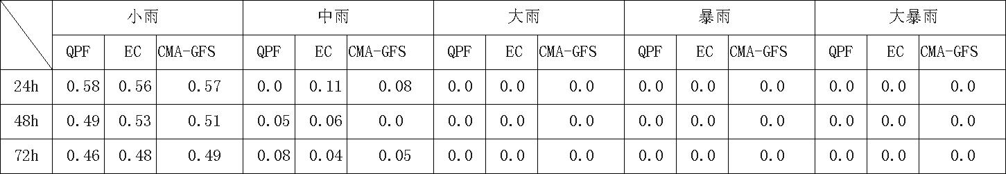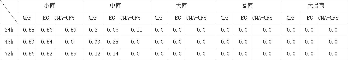 表1 预报员、ECMWF_HR、CMA-GFS模式各量级降水1-3天预报TS评分表