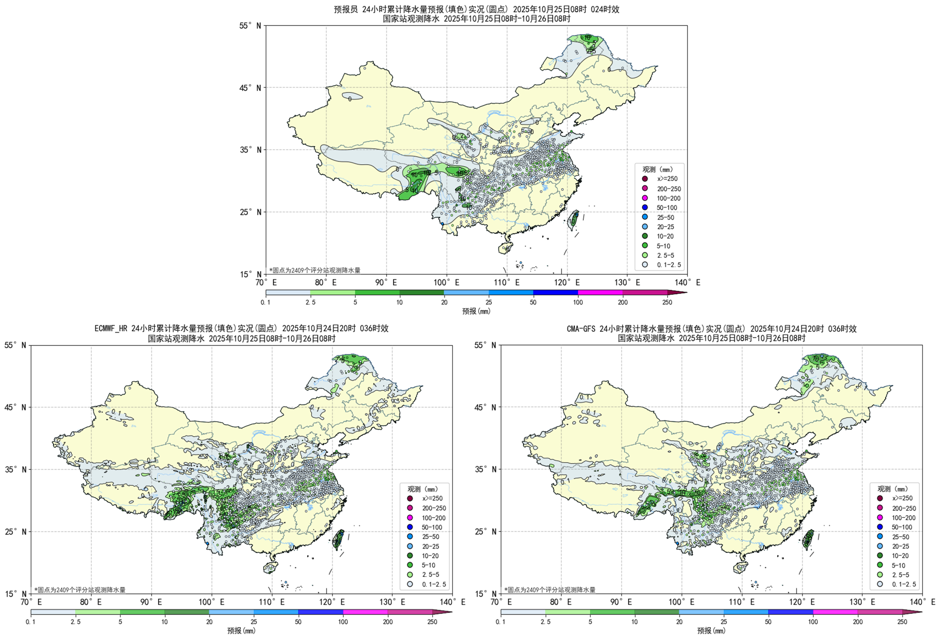 过去24小时,预报员对于小雨量级降水预报TS评分高于EC和CMA-GFS模式,对于中雨量级降水预报TS评分均低于EC和CMA-GFS模式。预报员均对于东北北部、黄淮、江淮、江汉、西北、西藏、西南及台湾等地的降水落区预报均有所体现,但对于江淮中部、甘肃中部及重庆等地的中雨量级降水有所漏报,对于云南南部及贵州东南部的降水落区有所漏报。各家模式对于青海南部及西藏北部的降水落区有所空报。