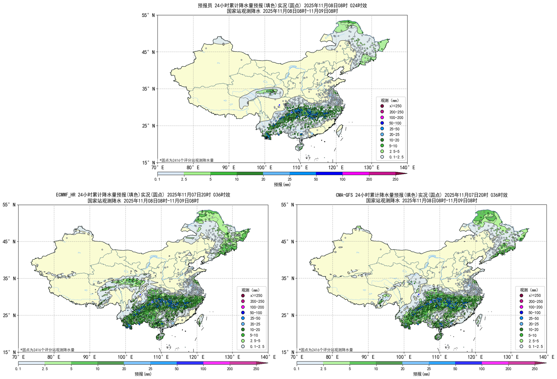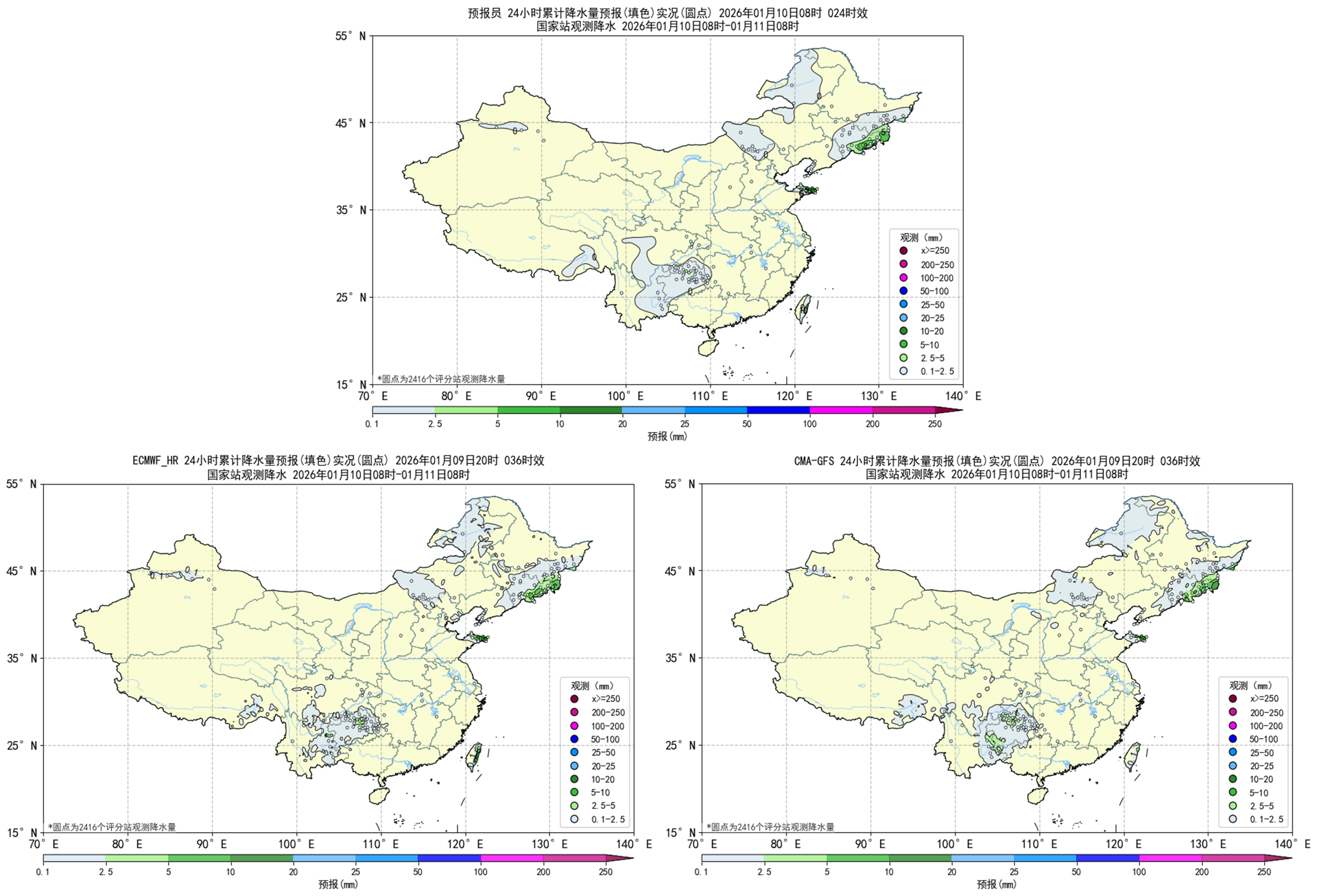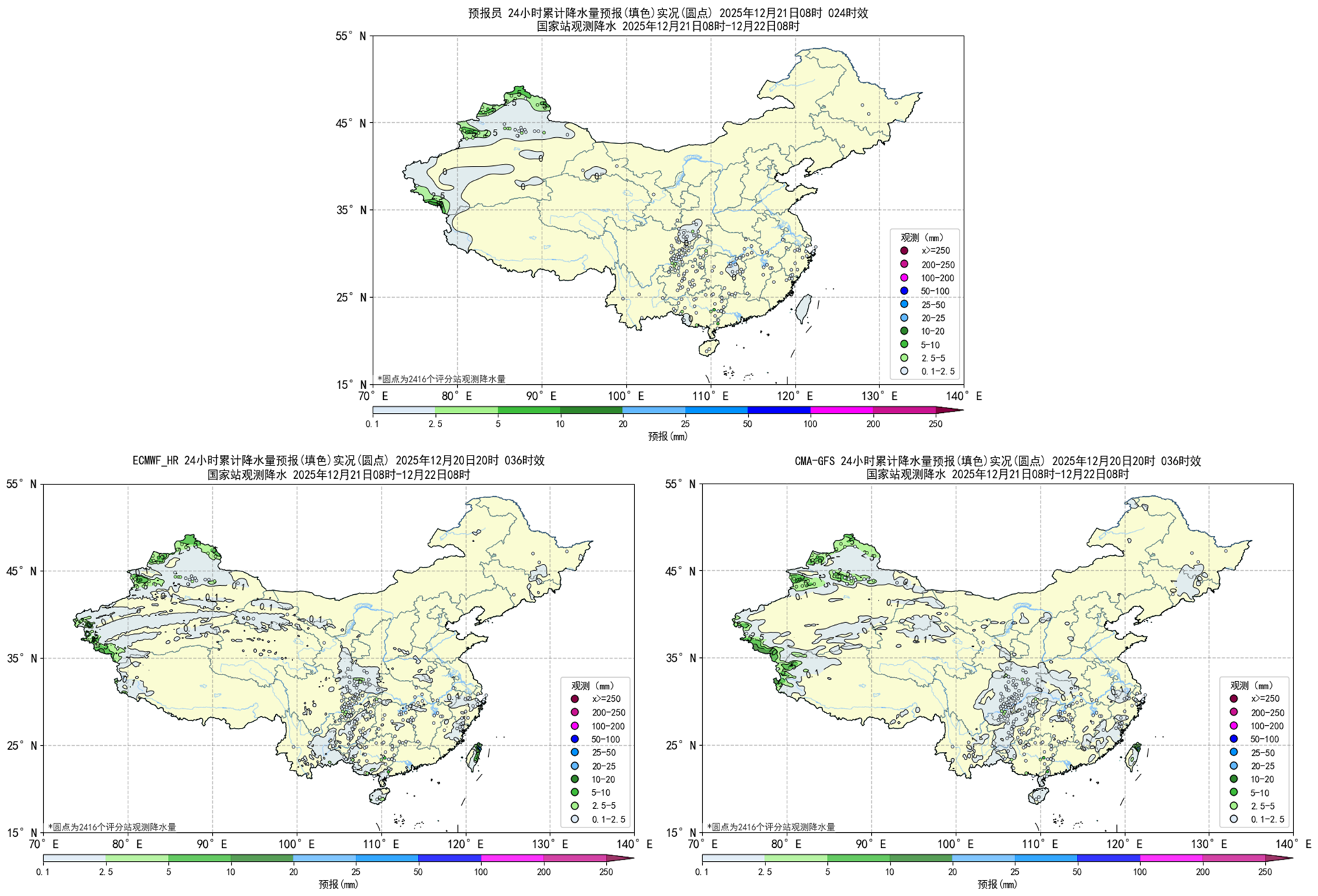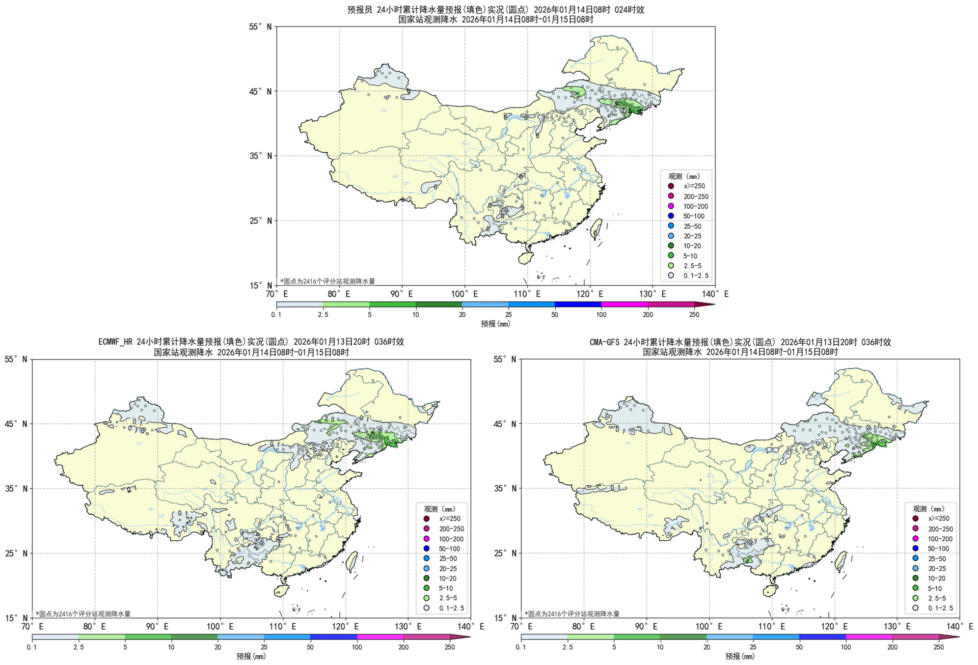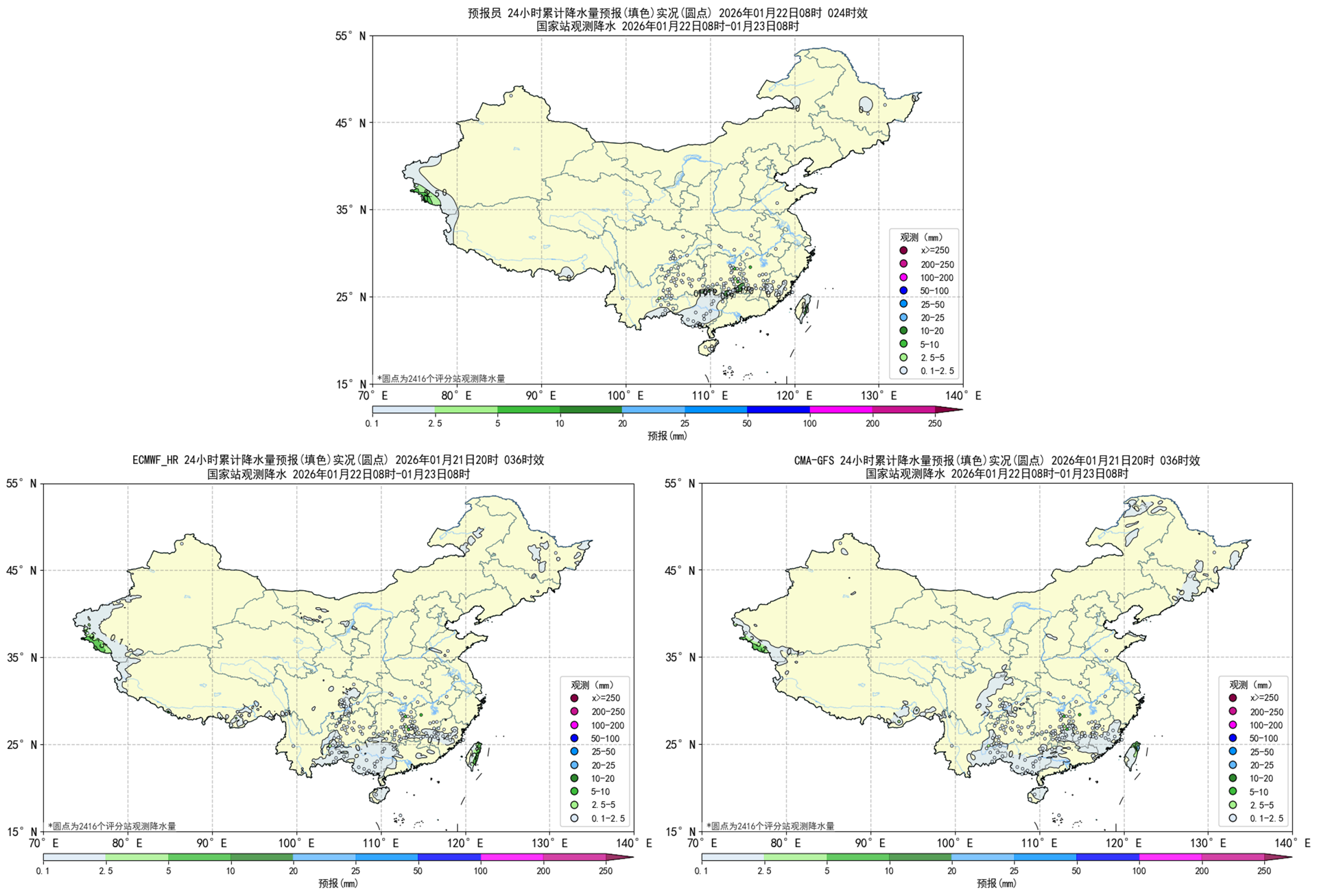 图2.1预报员、ECMWF_HR、CMA-GFS降水天气学检验