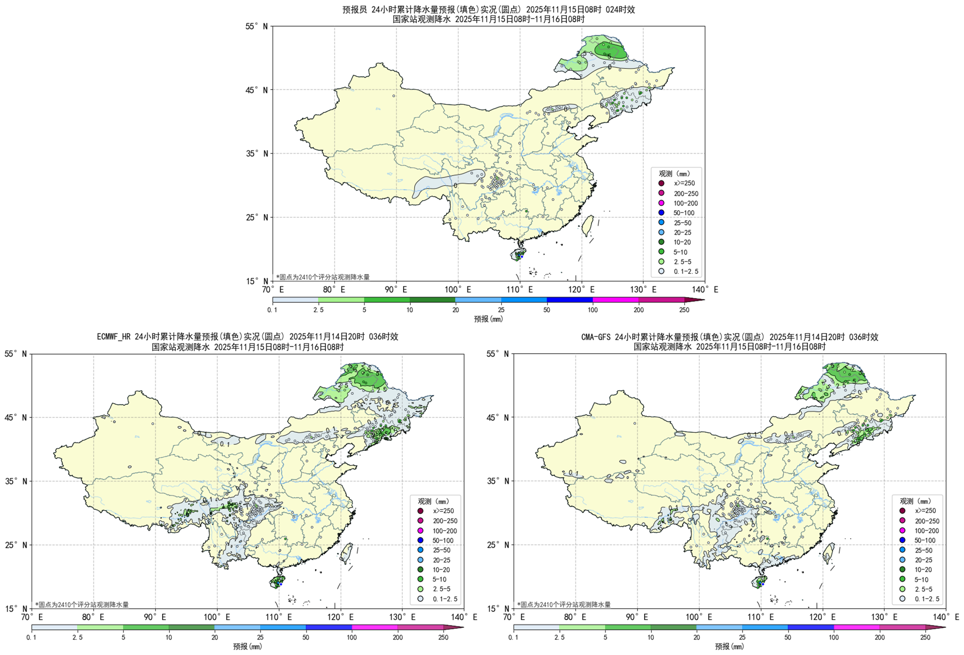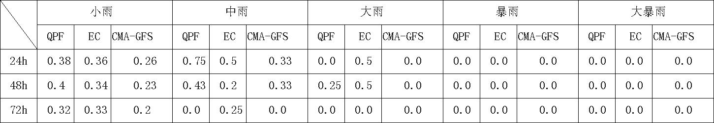 过去24小时,EC模式对内蒙古东北部和中部、黑龙江西北部、吉林中部、河北北部、海南岛东南部的大雨预报TS评分较高,预报员对小雨和中雨的预报TS评分高于模式,但是对大雨漏报。