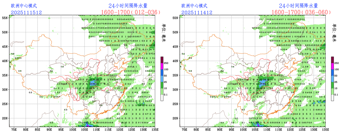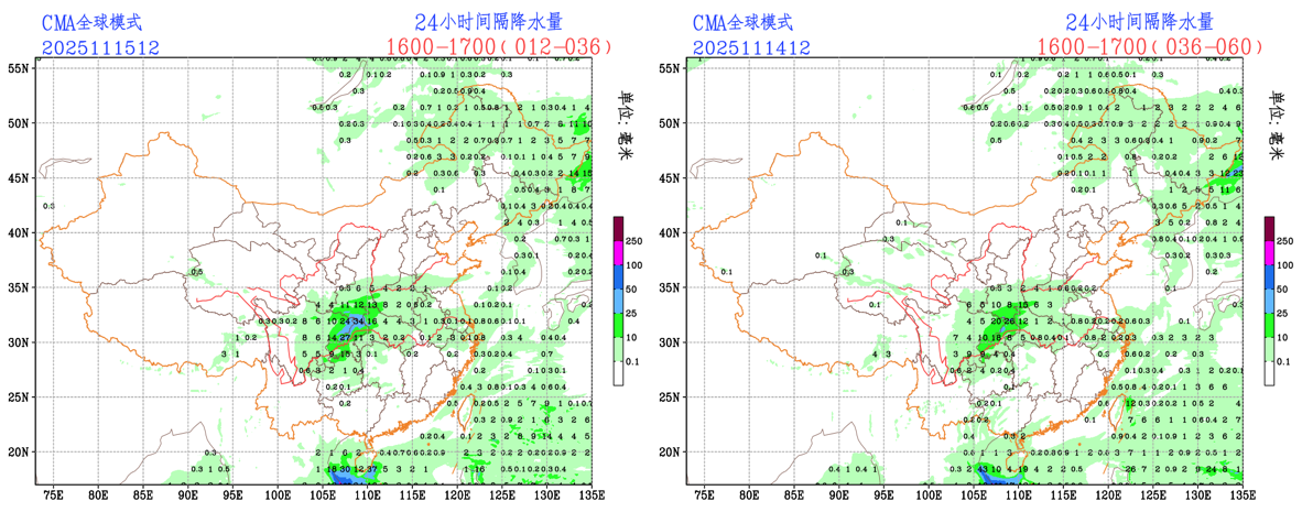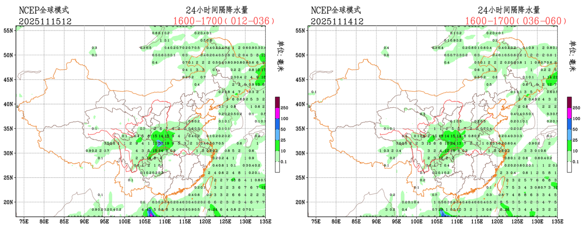 未来24小时,EC、CMA-GFS和NCEP模式对四川东北部、陕西南部等地的降水量级预报均有所调整,预报员可参考模式预报结果进行预报订正。