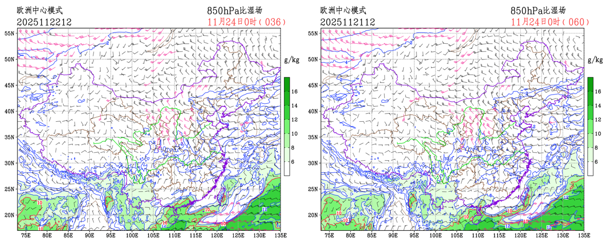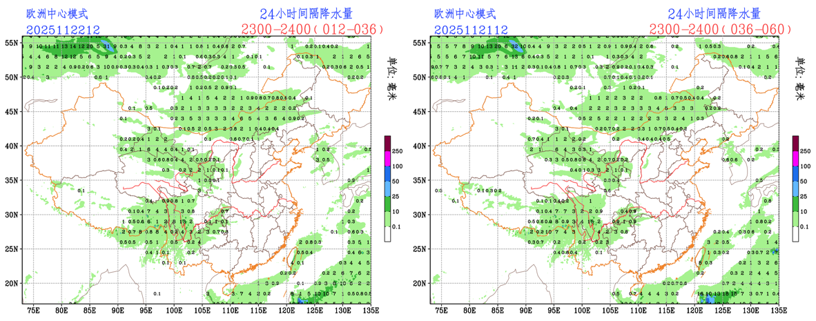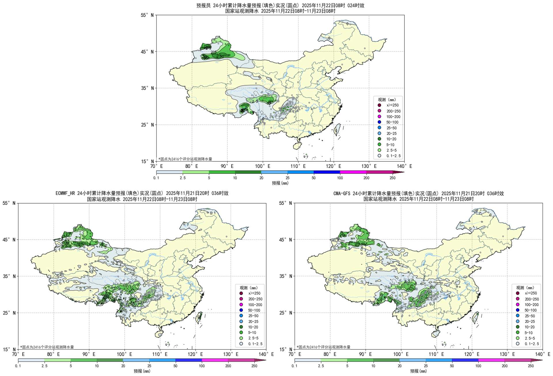 过去24小时,预报员对于小雨量级降水的预报TS评分高于EC模式和CMA-GFS模式,对中雨量级降水的预报TS评分低于EC模式,高于CMA-GFS模式。预报员对新疆北部、西藏西部、四川北部和贵州大部的降水落区有所体现,对青海西南部有一定的空报。