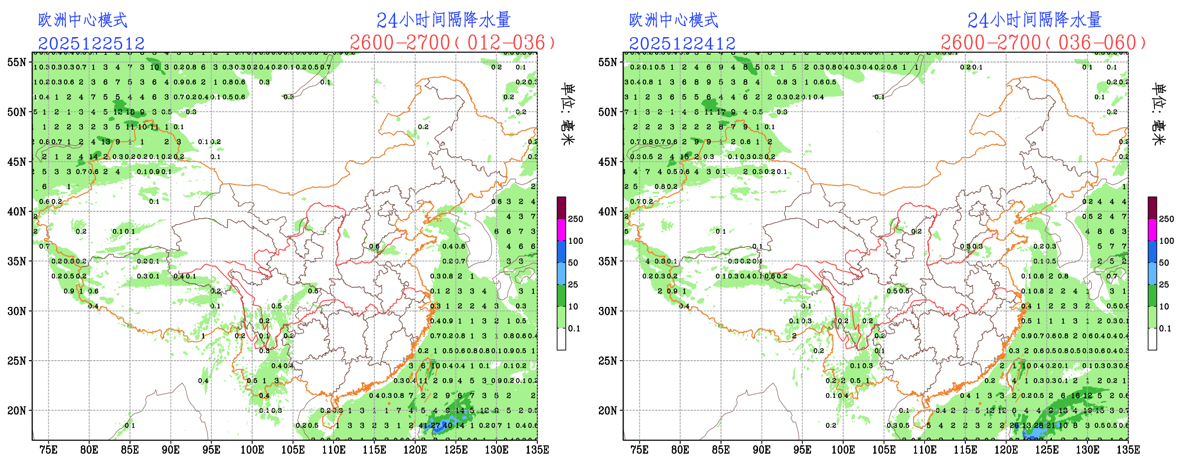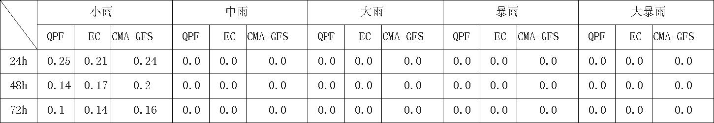 过去24小时,预报员对小雨量级降水预报的TS评分高于EC模式和CMA-GFS模式。预报员对东北东部、山东半岛和华南沿海的降水有一定的体现,对江南地区的降水有所漏报。