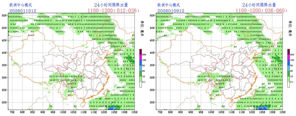 过去24小时,预报员对小雨量级降水预报TS评分略低于EC模式。预报员对内蒙古东北部降水略有空报,CMA模式对西南地区南部的小雨量级降水略有空报。