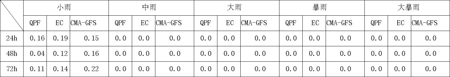 过去24小时,预报员对小雨量级降水预报TS评分略优于CMA-GFS模式,但低于EC模式;预报员对贵州大部、湖北东部、江西中部、福建大部的降水存在漏报;EC模式对贵州大部、湖北东部、江西中部、福建中部的降水存在漏报;CMA-GFS模式对贵州大部、湖北东部、江西中部的降水存在漏报。