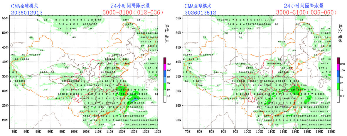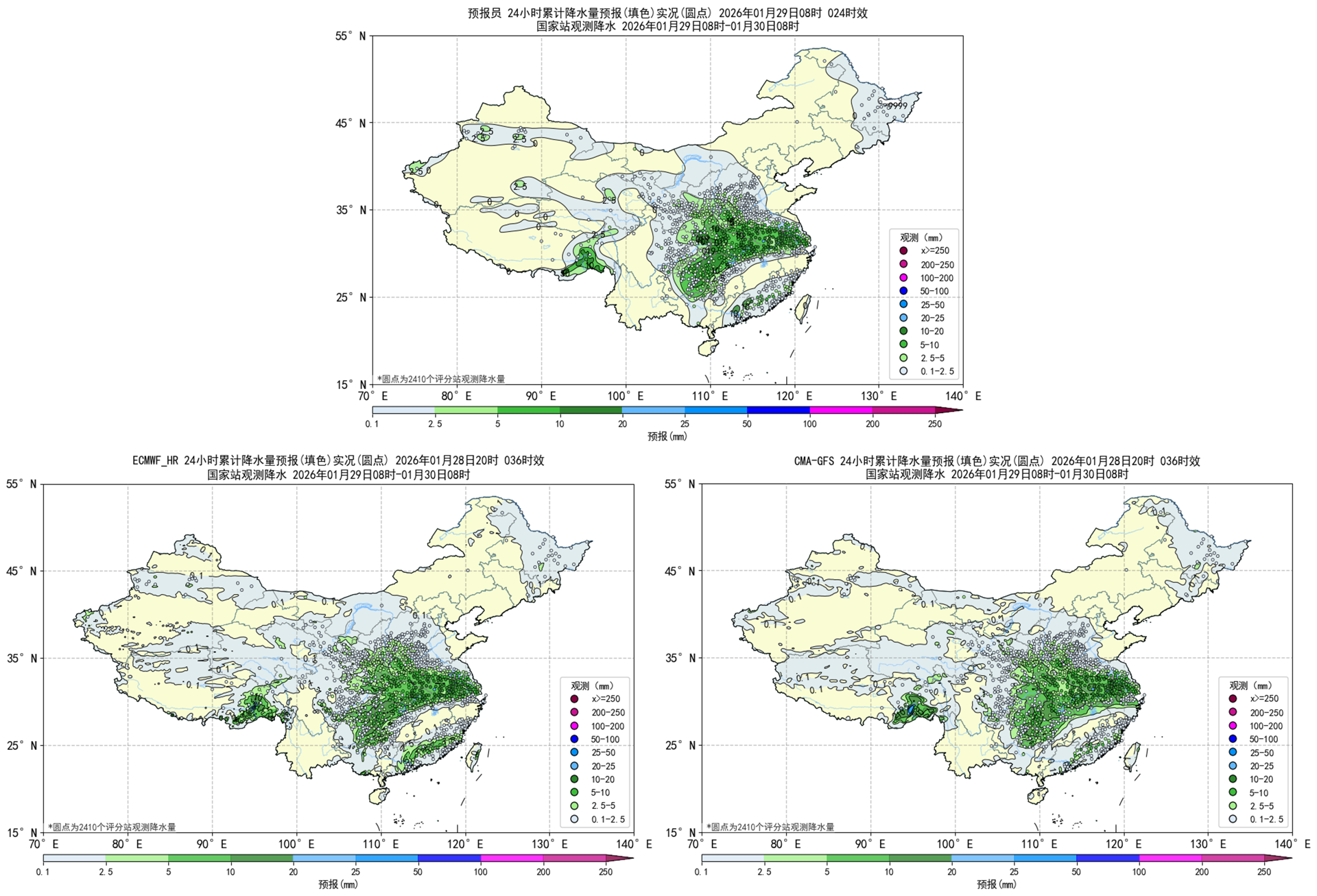 过去24小时,预报员对小雨量级降水预报TS评分优于模式、预报员对中雨量级降水预报TS评分略低于CMA-GFS模式;预报员对江苏中部、华南局地的降水存在低估。