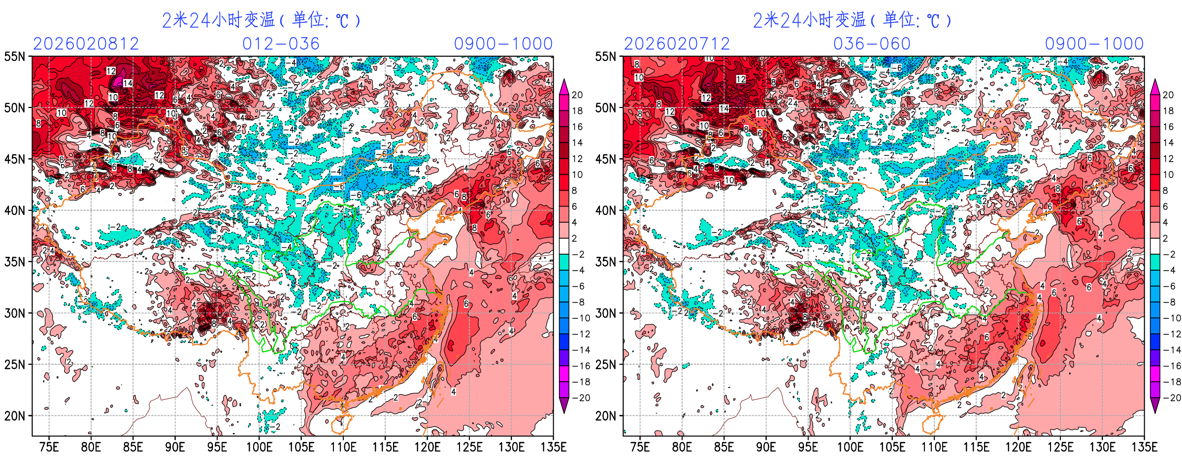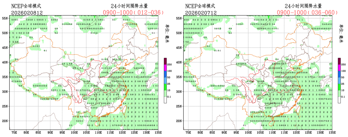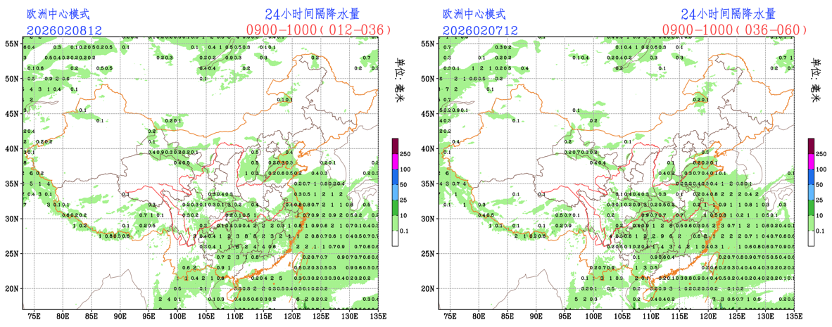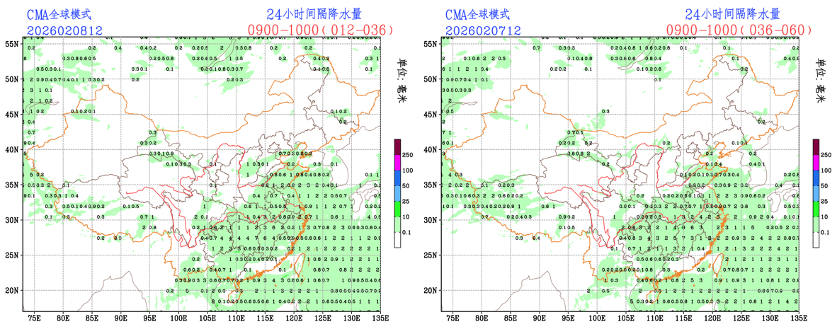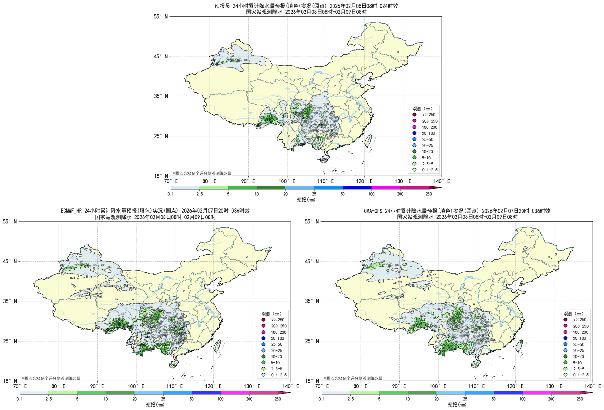 过去24小时,预报员对小雨量级的降水预报TS评分低于EC模式和CMA-GFS模式,对中雨量级的降水预报TS评分高于EC模式和CMA-GFS模式。预报员对北疆、西藏地区东部、西北地区东南部、西南地区、江南地区西部的降水有一定的体现,无明显漏报、空报过程。CE模式和CMA-GFS模式对上述地区的降水有一定体现,但对青海西部、新疆南部等地区有一定的空报。