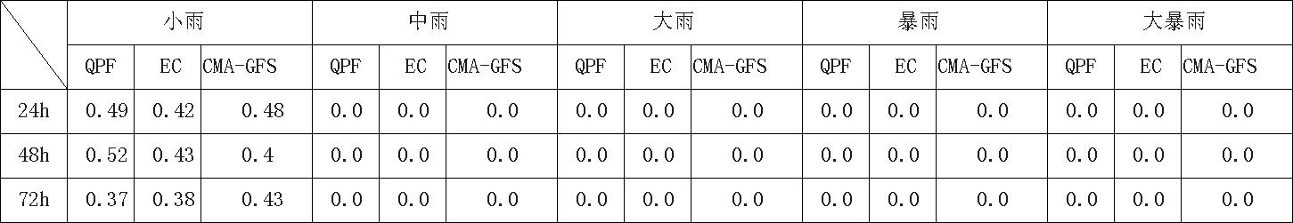 过去24小时,预报员对于小雨量级的降水预报TS评分优于EC模式和CMA-GFS模式。整体来看EC模式和CMA-GFS模式对于新疆北部、西藏东南部、四川中部和江南大部地区的降水量级和落区预报均具有较好的指示意义,但对江西北部和浙江南部等地的降水有所漏报。