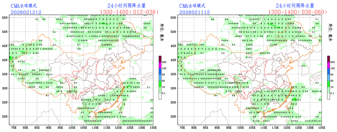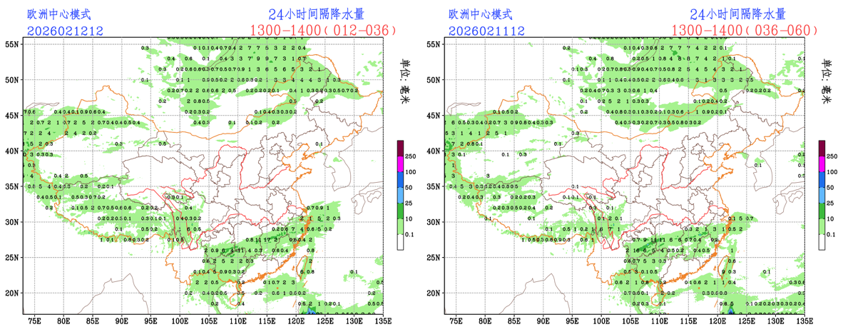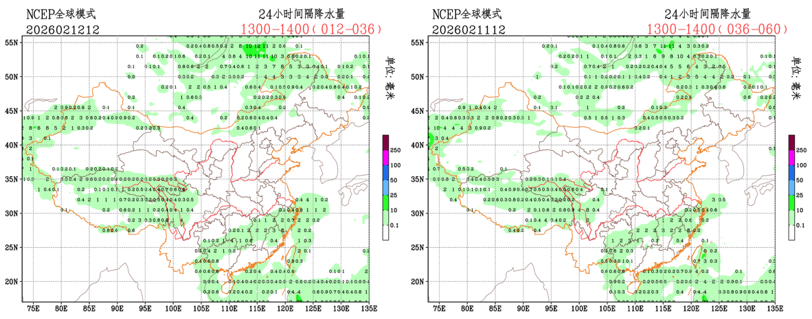 未来24小时,EC模式和CMA-GFS模式对西藏地区中部的降水落区有所调整,落区范围和降水量级均有所调小;NCEP模式的降水预报调整较小。整体来看,各家模式的降水预报不确定性较小,预报员可参考模式调整进行预报订正。
