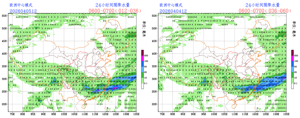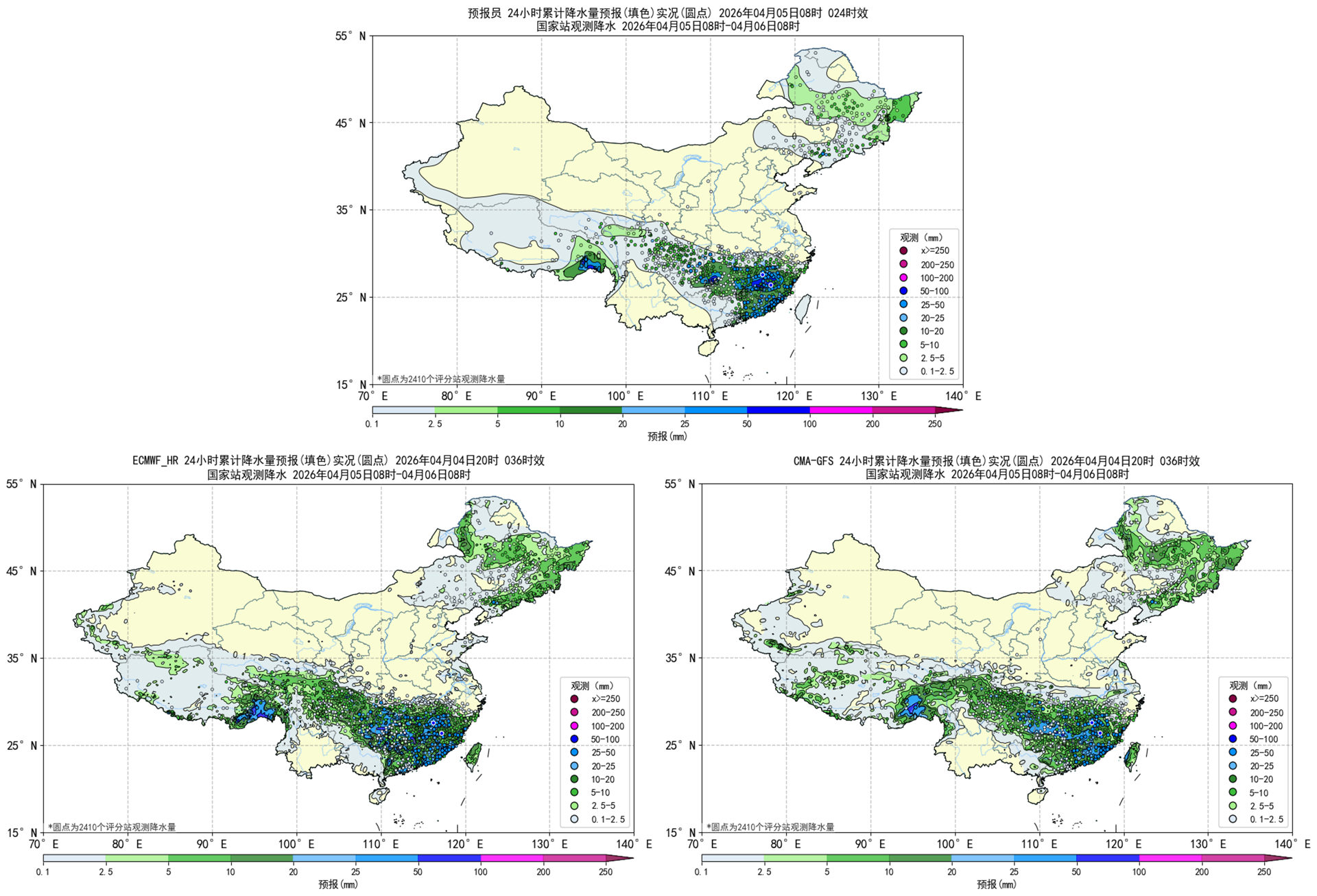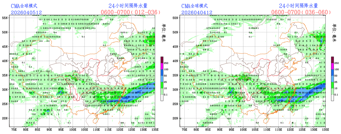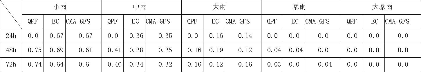 过去24小时,预报员对小雨、中雨、大雨量级的降水预报TS评分低于EC模式和CMA-GFS模式。预报员对东北地区、江南、华南、西南地区大部和西藏南部的降水落区有一定的体现,但对西藏大部和山东半岛的降水有空报。EC模式和CMA模式对东北地区、江南、华南、西南地区大部和西藏南部的降水落区有一定的体现,但对新疆东南部和西藏大部的降水有一定的空报。