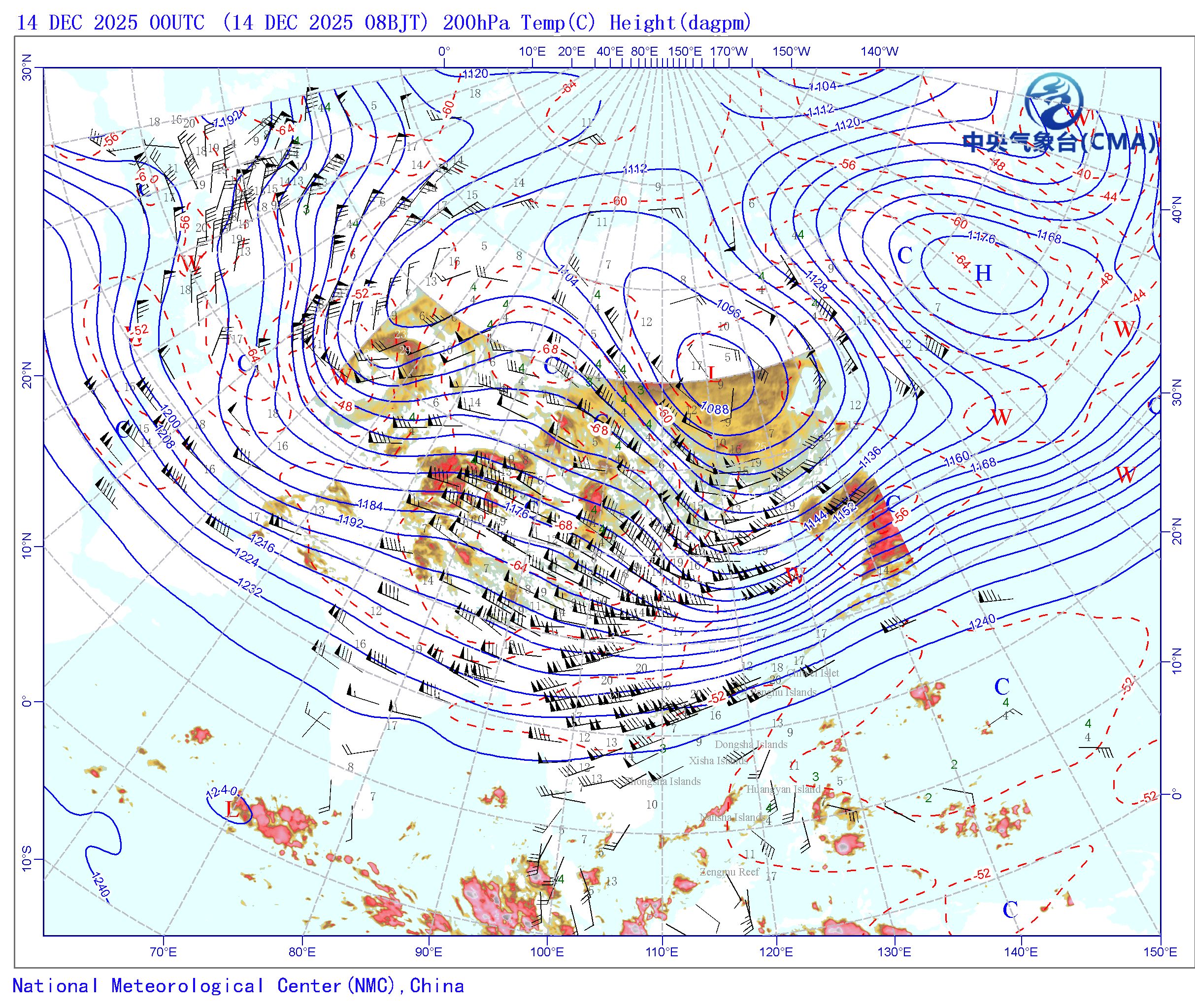 站点的填图要素包括:风向风速和温度露点差;天气系统符号包括:高压中心(H)、低压中心(L)、暖中心(W)、冷中心(C)和台风符号;蓝色等值线为等高线(单位dagpm);红色等值线为等温线(单位℃),其中零摄氏度以下以虚线显示;底层填色为地形高度;顶层填色为红外卫星云图。